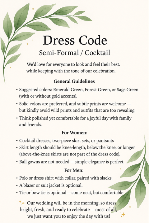 We’re having an unplugged ceremony—that means no phones, cameras, or videos while we say our “I do’s.” We’d love for you to be fully present with us in this special moment. Don’t worry—our photographer will capture all the magic, and we’ll share those memories afterwards. However, photos and videos are very welcome during the reception—tag us afterwards and help us relive our special day!
